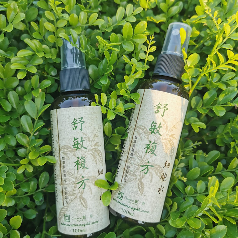 - 舒敏複方細胞水:抗/消炎、抗菌、止癢、舒緩敏感,配方含馬齒莧細胞水、9種純露(紫蘇、左手香、艾草、迷迭香、檸檬香蜂草、薰衣草、羅馬洋甘菊、檜木、茶樹)